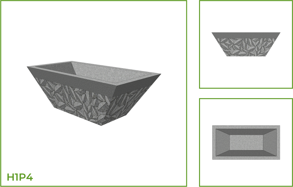 DESCRIPTION: This is a long trough pot with a wide upper edge that narrows down towards the base. This pot blends into both interior and exterior spaces either singularly or as a group. A collection of this pot may also be used to mark space boundaries. Apart from the plain model, this design is available with a variety of surface patterns on it such as horizontal lines, strips of parallel slanting lines, and foliage patterns.