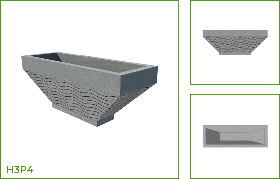 DESCRIPTION: This rectangular shaped pot has a wide, open mouth that narrows towards the foot. The highly utilitarian pot blends well with all kinds of spaces as a planter. The different variants available in this design are a combination of horizontal textured bands, parallel lines, chessboard design, and wavy parallel lines.