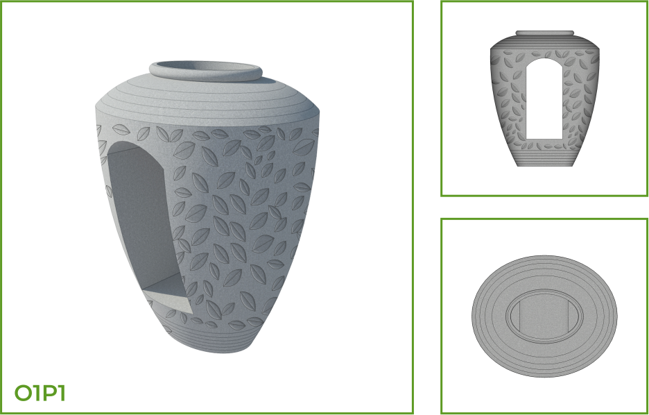 DESCRIPTION: This is an incense burner like shaped pot which is rimless and has a narrow neck with a wide shoulder and a large belly which has been torn to create a chamber. The belly narrows down to a small, flat base. This planter accentuates interior and exterior spaces and is available with various patterns in different segments of the pot such as thick dark rings and wavy lines, textured segments, and a distinct composite pattern of thin lines and leaf patterns.