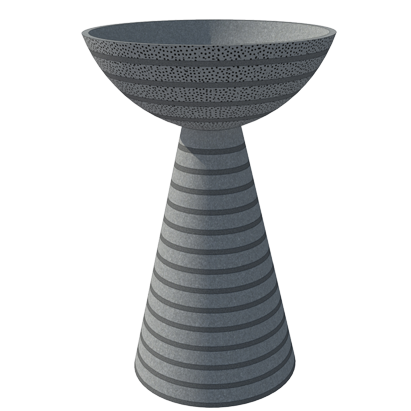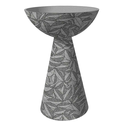 DESCRIPTION: This vertical pot is a composite structure made up of a bowl and a long conical pedestal that supports it. The landscape pot is ideal for exterior spaces as well as interiors. It comes with several patterns like foliage pattern along the entire structure, thick horizontal rings, dotted textures on the bowl. Also available are two composite patterns with thin horizontal lines along the rim area of the bowl with vertical line columns along the pedestal and thick horizontal rings along the bowl with a column of V shaped design on the pedestal.