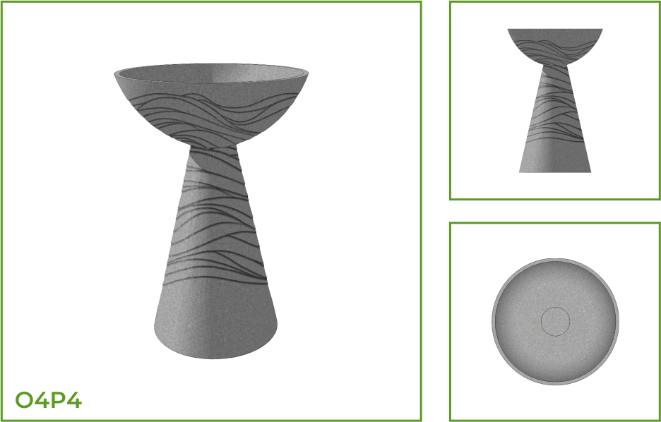 DESCRIPTION: This vertical pot is a composite structure made up of a bowl and a long conical pedestal that supports it. The landscape pot is ideal for exterior spaces as well as interiors. It comes with several patterns like foliage pattern along the entire structure, thick horizontal rings, dotted textures on the bowl. Also available are two composite patterns with thin horizontal lines along the rim area of the bowl with vertical line columns along the pedestal and thick horizontal rings along the bowl with a column of V shaped design on the pedestal.