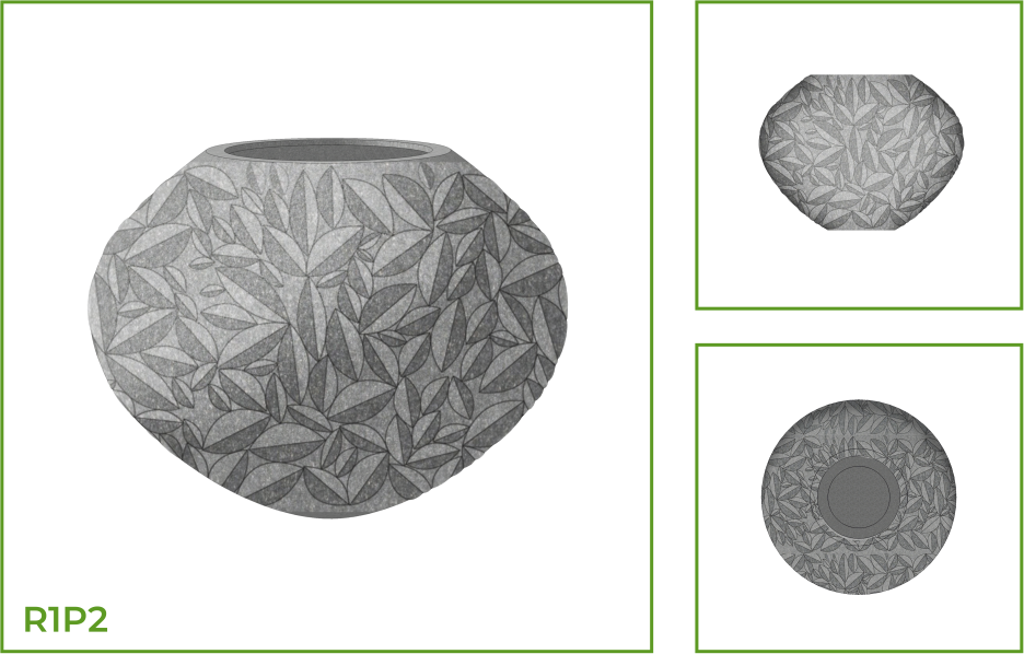 DESCRIPTION: This round pot has an open mouth on the top and widens at the belly and then narrows into a deep convex base. This is designed to be a plantation pot that fits both interior and exterior spaces, as a single piece or as a collection. The different customizations available in this design are thick rings, wave patterns, segments of intersecting slanting lines, and several segments on thin lines along the entire pot.