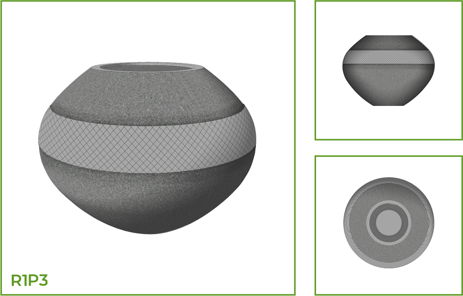 DESCRIPTION: This round pot has an open mouth on the top and widens at the belly and then narrows into a deep convex base. This is designed to be a plantation pot that fits both interior and exterior spaces, as a single piece or as a collection. The different customizations available in this design are thick rings, wave patterns, segments of intersecting slanting lines, and several segments on thin lines along the entire pot.