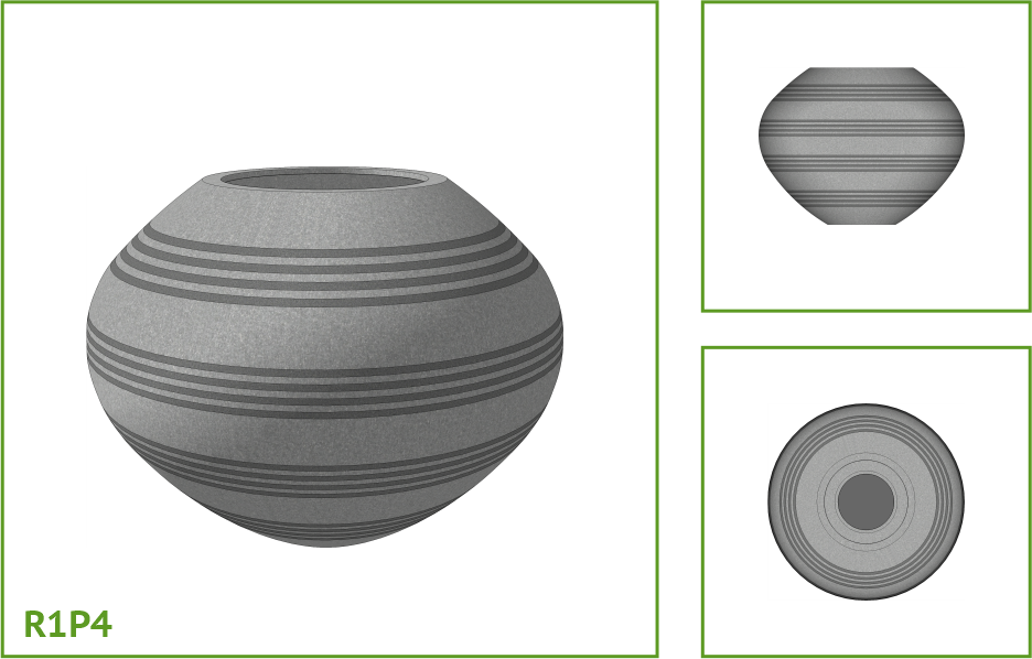 DESCRIPTION: This round pot has an open mouth on the top and widens at the belly and then narrows into a deep convex base. This is designed to be a plantation pot that fits both interior and exterior spaces, as a single piece or as a collection. The different customizations available in this design are thick rings, wave patterns, segments of intersecting slanting lines, and several segments on thin lines along the entire pot.