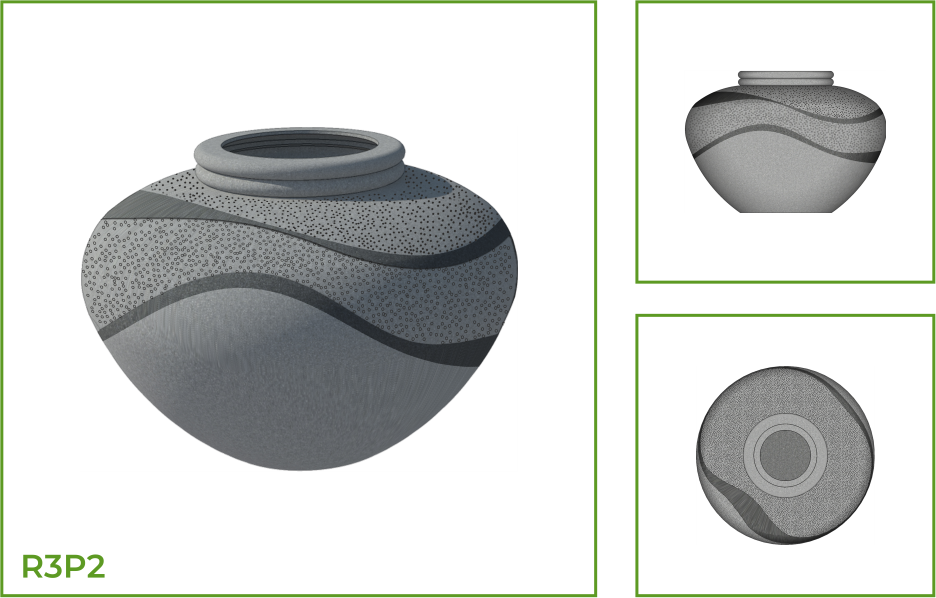 DESCRIPTION: Shaped like a traditional Indian jar, this pot with a narrow rim opens into a large belly that tapers towards the base. The shape of the pot imparts an ethnic feel to the spaces that house it. This landscape pot may be used as a single piece or as a collection. The interesting patterns available in this design are thin lines, dotted textured patterns, foliage, and thick circular rings running around the full body of the pot.