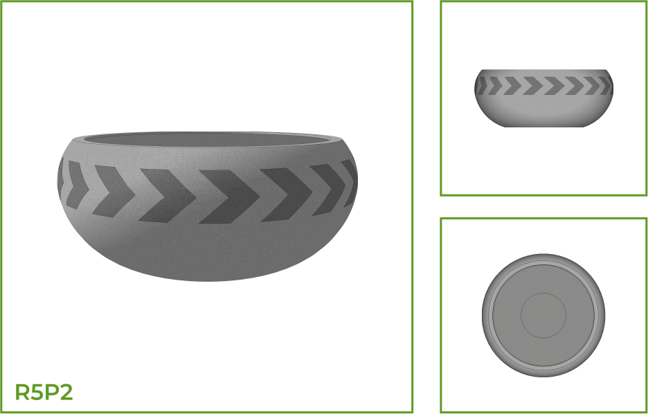 DESCRIPTION: This pot is shaped like a large deep bowl with a wide, open mouth that rests on a flat base. The pot is suited for plantation purposes and fits equally into external landscapes as well as interiors. It is available with several geometric patterns like arcs and angular line segments, thick rings, and wavy ring patterns.
