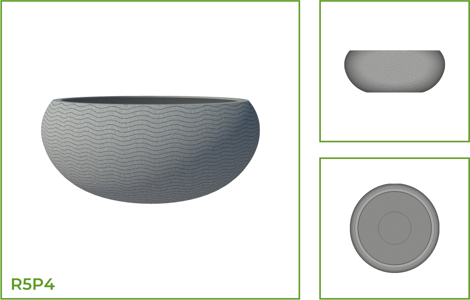 DESCRIPTION: This pot is shaped like a large deep bowl with a wide, open mouth that rests on a flat base. The pot is suited for plantation purposes and fits equally into external landscapes as well as interiors. It is available with several geometric patterns like arcs and angular line segments, thick rings, and wavy ring patterns.