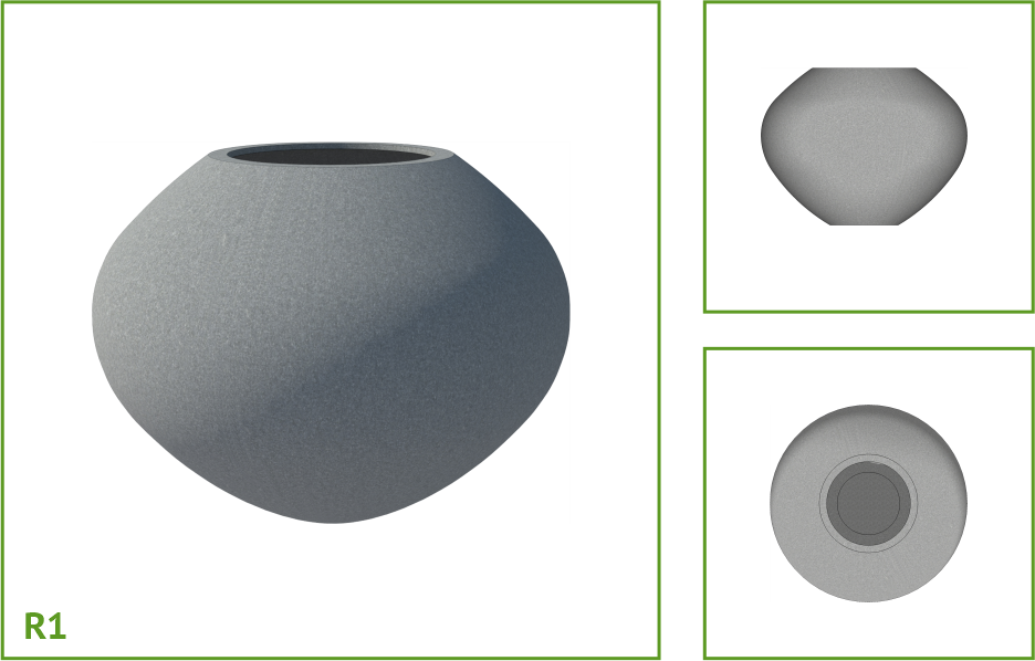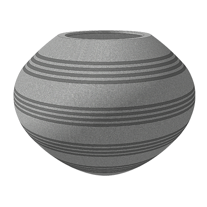 DESCRIPTION: This round pot has an open mouth on the top and widens at the belly and then narrows into a deep convex base. This is designed to be a plantation pot that fits both interior and exterior spaces, as a single piece or as a collection. The different customizations available in this design are thick rings, wave patterns, segments of intersecting slanting lines, and several segments on thin lines along the entire pot.