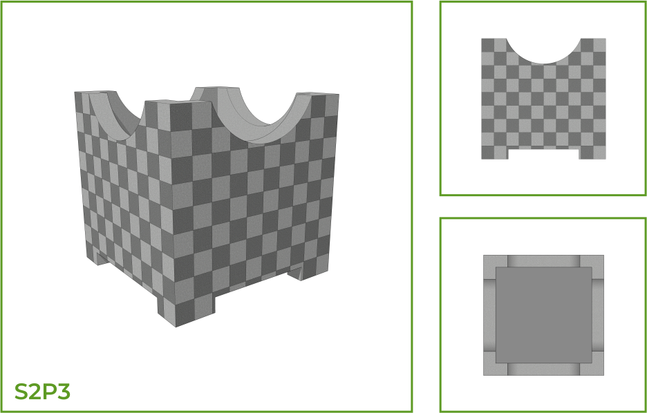 DESCRIPTION: This square pot with four legs is designed like a box with all four top edges concaving in the center to create a unique appearance. This planter is contained in design and adapts well into interior as well as exterior spaces, singularly or as a group as dividers. It is available with several interesting patterns on it such as thin horizontal parallel running lines, belts of six thin horizontal parallel lines, thin vertical lines and classic chess board design.