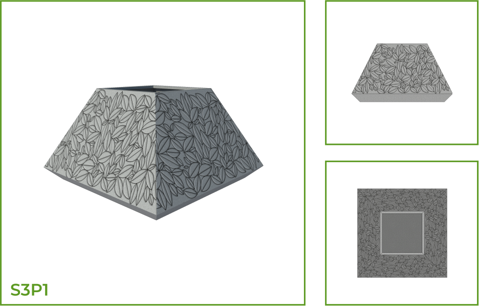 DESCRIPTION: This trapezium-shaped planter is narrow on the upper edge and broadens towards a wide flat base. The elegant design adds a dimension of class to every space that houses it. The pot may be used as a single piece or in an arrangement of several pieces. This pot is available in different patterns such as foliage, intersecting wavy lines, segments of geometric arcs and the simple slanting line design.