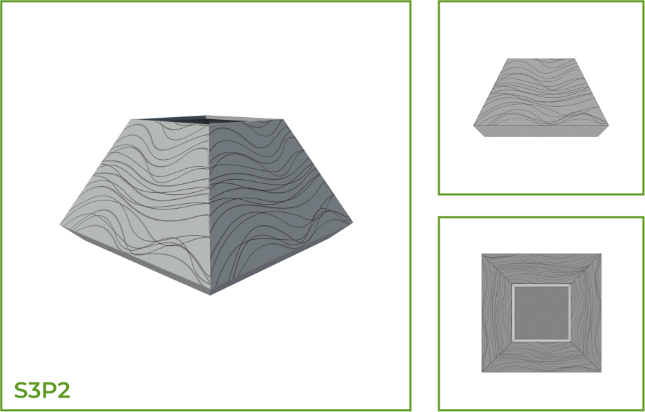 DESCRIPTION: This trapezium-shaped planter is narrow on the upper edge and broadens towards a wide flat base. The elegant design adds a dimension of class to every space that houses it. The pot may be used as a single piece or in an arrangement of several pieces. This pot is available in different patterns such as foliage, intersecting wavy lines, segments of geometric arcs and the simple slanting line design.