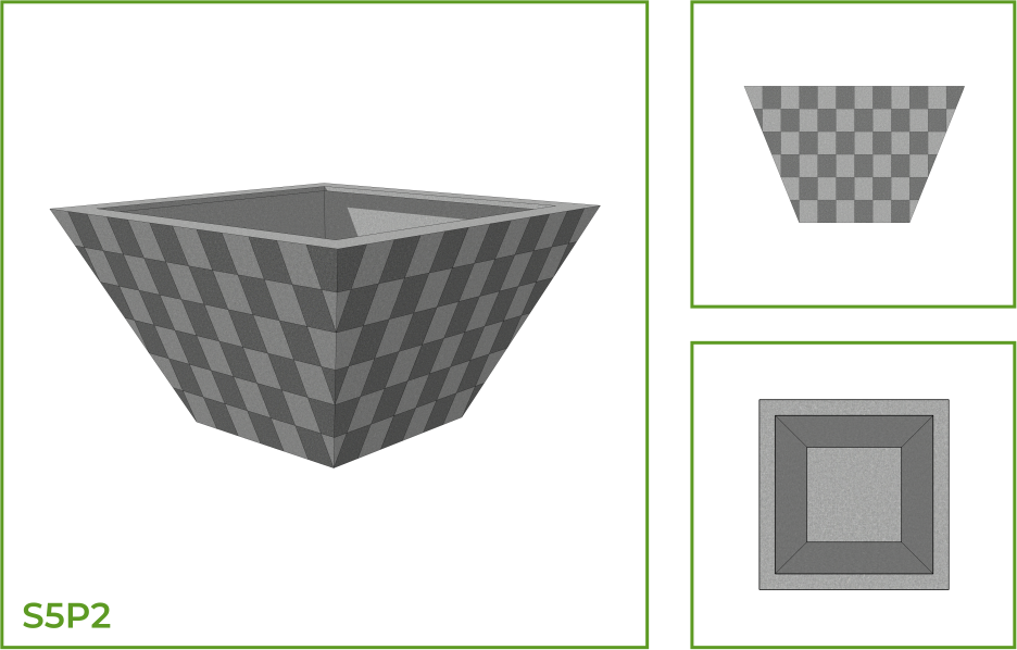 DESCRIPTION: This is a unique pot with a wide mouth and a wide body that tapers down into a narrow flat base. With plants in it, this pot transforms itself into a perfect fit into both interior and exterior spaces. This planter comes with a variety of patterns like the chessboard, horizontal parallel lines that run along the entire body, segments of slanting lines and a belt of foliage pattern.