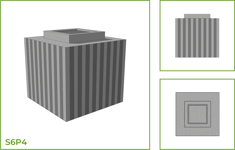 DESCRIPTION: The square pot has a small square neck that is fused onto a larger box structure to create a pot that is crafted specially to hold plants. The pot may be used as a single piece or several of them may be arranged side by side to create a boundary in both internal and external spaces. This is available in a number of patterns such as thin horizontal parallel lines, vertical lines and chessboard design.