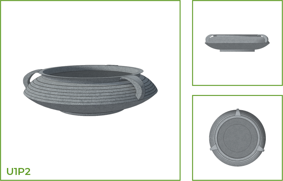 DESCRIPTION: This pot is shaped like a traditional Indian vessel called urli. It has an open mouth, wide belly that rests on a heavy base. With a handle on each side this pot can be easily moved. The shape of the pot makes it a perfect fit into all kinds of spaces either as a single piece or as a group. This pot is available customized with special patterns like dotted texture, circular rings, wave and arc patterns.