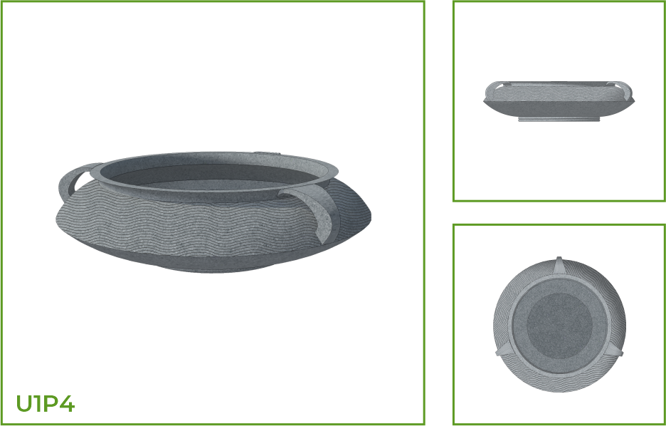 DESCRIPTION: This pot is shaped like a traditional Indian vessel called urli. It has an open mouth, wide belly that rests on a heavy base. With a handle on each side this pot can be easily moved. The shape of the pot makes it a perfect fit into all kinds of spaces either as a single piece or as a group. This pot is available customized with special patterns like dotted texture, circular rings, wave and arc patterns.