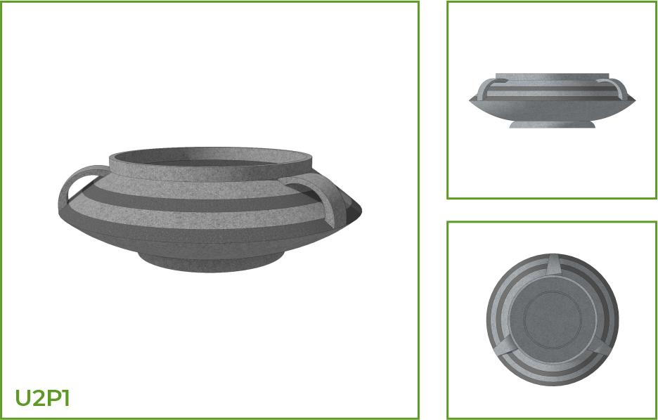 DESCRIPTION: This urli pot with a narrow neck and a wide belly rests on a small foot. The plantation pot which blends easily with interior and exterior and spaces comes with a handle on either side. Its design is capable of transforming the space as a single piece or as a collection. The customizations available in this line have patterns such as two thick rings, a segment of angular lines, and a patterned belly with thin lines.