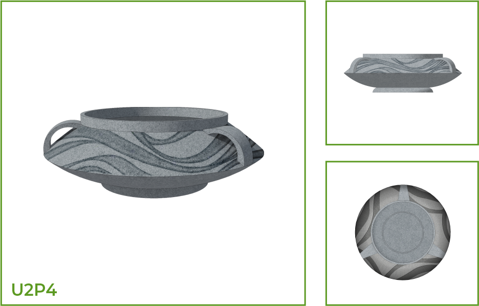 DESCRIPTION: This urli pot with a narrow neck and a wide belly rests on a small foot. The plantation pot which blends easily with interior and exterior and spaces comes with a handle on either side. Its design is capable of transforming the space as a single piece or as a collection. The customizations available in this line have patterns such as two thick rings, a segment of angular lines, and a patterned belly with thin lines.