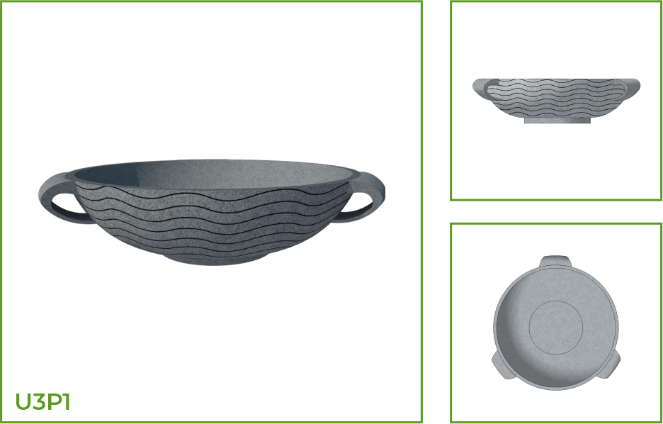 DESCRIPTION: This urli is shaped like a wide open bowl with short handles on either side which helps in easy movement of the pot. The convex belly rests on a small foot. This plantation pot transforms itself to support both traditional and contemporary spaces. The design offers patterns such as wavy and thin lines along the entire body, segments of intersecting slanting lines and arc patterns.