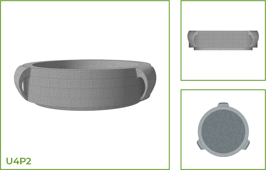 DESCRIPTION: This simple shaped urli with a wide, open mouth, straight sides and a flat wide base comes with a handle on either side. This pot when it holds plants adds elegance to interior and exterior spaces alike. The design is available with patterns on its body such as vertical lines, columns of square compartments with horizontal and vertical lines, belts of arrows and intersecting wavy lines.
