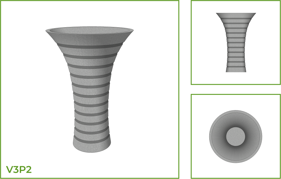 DESCRIPTION: This is a wide mouthed pot shaped like a vase that narrows towards the base. The simple and clean form of this pot makes it a perfect fit into both interior and exterior spaces, as a single piece or as a group. Several patterns are available to choose from such as circular ring patterns along the body, arc patterns, dotted textures and wavy lines.