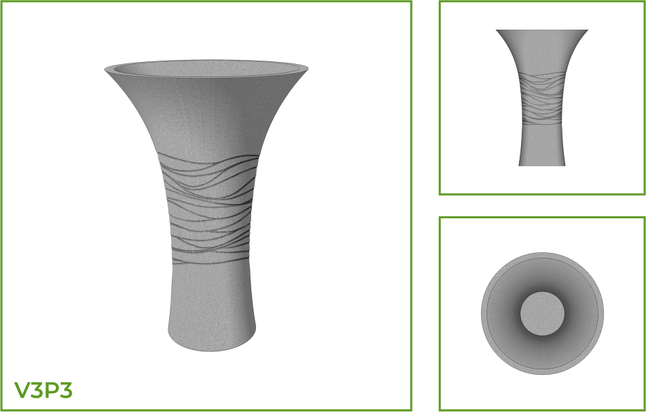 DESCRIPTION: This is a wide mouthed pot shaped like a vase that narrows towards the base. The simple and clean form of this pot makes it a perfect fit into both interior and exterior spaces, as a single piece or as a group. Several patterns are available to choose from such as circular ring patterns along the body, arc patterns, dotted textures and wavy lines.