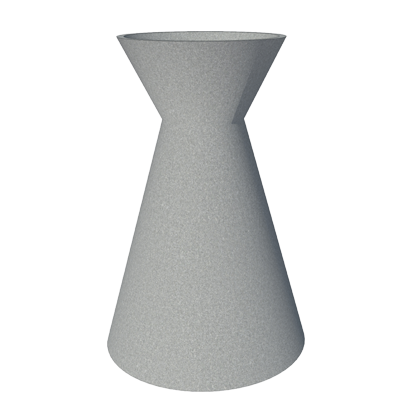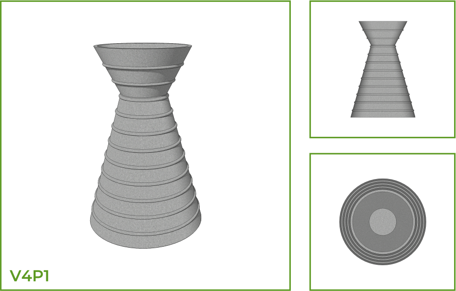 DESCRIPTION: This composite shaped pot has a funnel shaped neck that leads to a conical body. Designed for plantation purposes this pot can be placed in interior and exterior places alike. The patterns customized in this design are horizontal circular ridges, vertical lines and horizontal wavy lines around the body of the pot. A unique foliage pattern is also available.