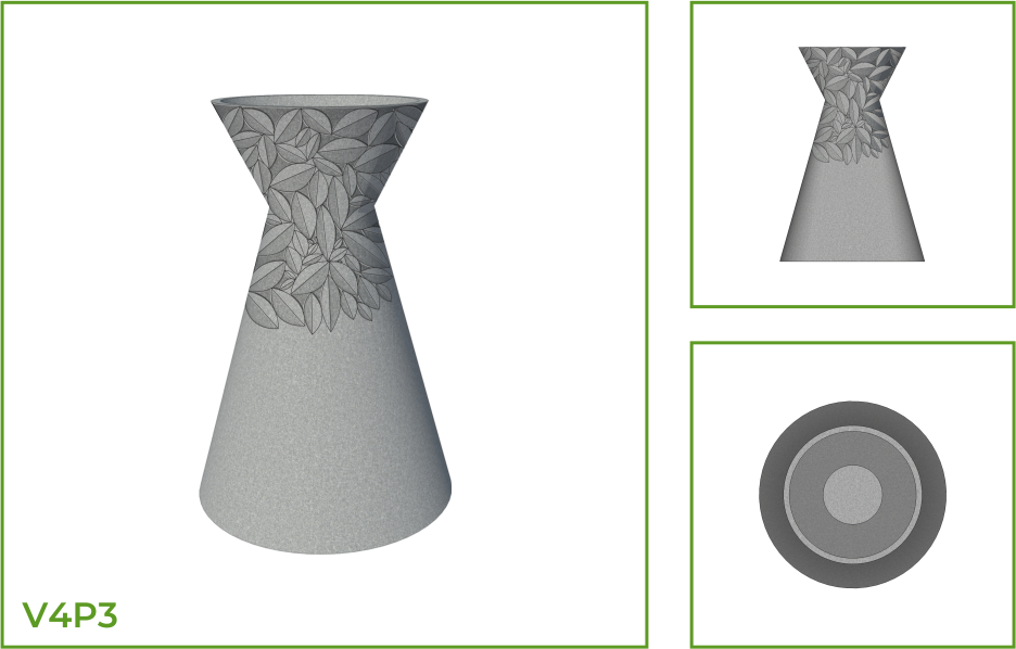DESCRIPTION: This composite shaped pot has a funnel shaped neck that leads to a conical body. Designed for plantation purposes this pot can be placed in interior and exterior places alike. The patterns customized in this design are horizontal circular ridges, vertical lines and horizontal wavy lines around the body of the pot. A unique foliage pattern is also available.