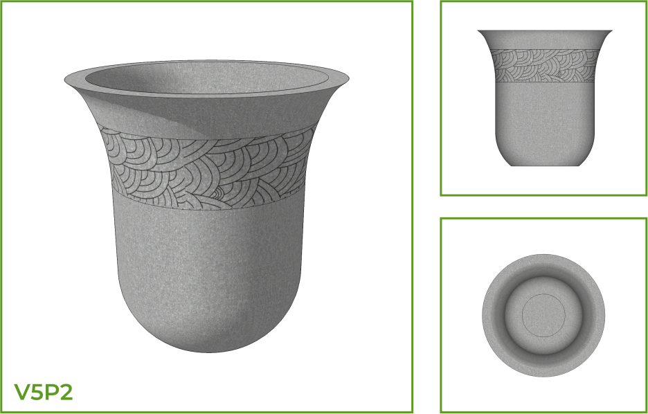 DESCRIPTION: This is an inverted bell shaped pot with a wide mouth and a large belly that leads to a convex base. The landscape pot is suited for all kinds of spaces and surfaces either as a single piece or as a group. Design has been customized with segments of double slanting lines and arc like patterns, belts of circular rings and lotus patterns on the lower belly right until the base, are also available.
