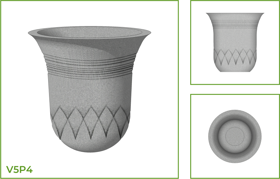 DESCRIPTION: This is an inverted bell shaped pot with a wide mouth and a large belly that leads to a convex base. The landscape pot is suited for all kinds of spaces and surfaces either as a single piece or as a group. Design has been customized with segments of double slanting lines and arc like patterns, belts of circular rings and lotus patterns on the lower belly right until the base, are also available.