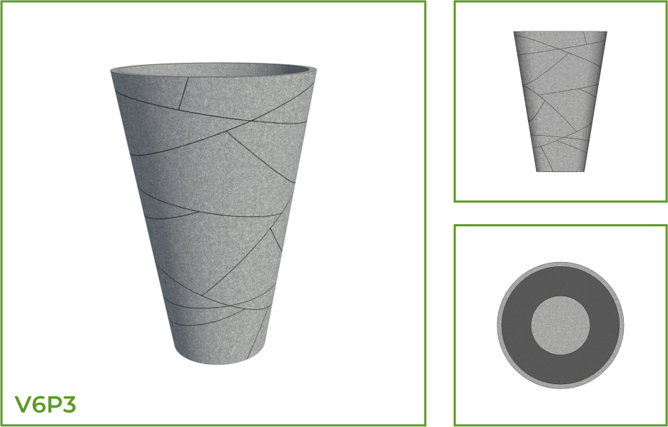 DESCRIPTION: This glass shaped vertical pot has a wide mouth the tapers into a narrow base. This simplistic design comes with customization like horizontal rings as a single or in groups of two along the full body of the pot. The other patterns are random tile compartments and thin horizontal lines. These pots add elegance to indoor as well as outdoor spaces.